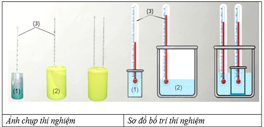 Để khảo sát quá trình truyền nhiệt năng và chiều truyền nhiệt năng giữa hai vật tiếp xúc nhau. Một nhóm học sinh thực hiện thí nghiệm sử dụng các dụng cụ và cách tiến hành như hình dưới: