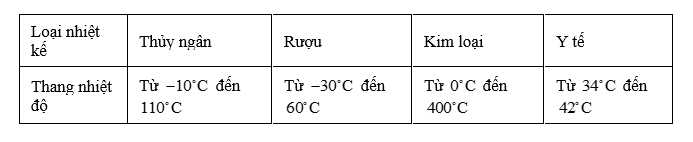 Bảng dưới đây ghi tên các loại nhiệt kế và nhiệt độ ghi trên thang đo của chúng. Để đo