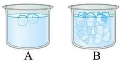 Hai cốc$A$ và cốc $B$ trong hình bên đang ở trạng thái cân bằng nhiệt, đều chứa nước và nước đá. So với nhiệt độ của nước trong cốc B thì nhiệt độ của nước trong cốc A