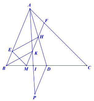 Cho tam giác ABC có AD là đường trung tuyến. Gọi M là điểm tùy ý thuộc khoảng BD. Lấy E thuộc AB và F thuộc AC sao cho $\text{ME}//\text{AC};\text{MF}//\text{AB}$. Gọi H là giao điểm MF và AD. Đường thẳng qua B song song với EH cắt MF tại K. Đường thẳng AK cắt BC tại I. Tính tỉ số $\dfrac{IB}{ID}$