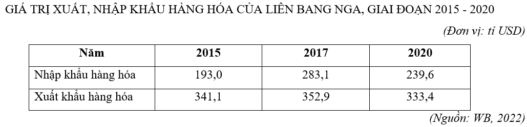 Căn cứ vào bảng số liệu trên, hãy cho biết cán cân xuất nhập khẩu của Liên bang Nga năm 2015 cao hơn năm 2020 là bao nhiêu tỉ USD? (làm tròn kết quả đến số thập phân thứ nhất)
