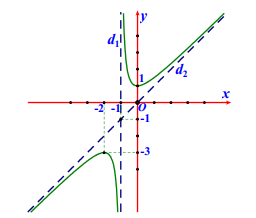 Cho hàm số $y = \dfrac{x^{2} + bx + c}{x + n}$ có đồ thị và hai đường tiệm cận $d_{1};d_{2}$ như hình vẽ dưới đây.
