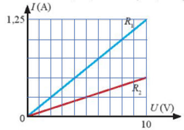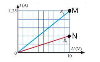 Đường đặc trưng vôn-ampe của hai điện trở R1 và R2 được cho như hình vẽ.