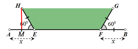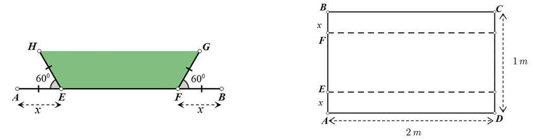 b) Anh Hà dự định làm một cái máng nước có dạng hình lăng trụ đứng có đáy là hình thang cân từ một miếng tôn có dạng hình chữ nhật $ABCD$ với chiều dài 2 m và chiều rộng 1 m. Anh Hà thực hiện làm máng nước bằng cách gấp đều hai bên chiều rộng $AB$ của miếng tôn, mỗi bên $x(m)$, lên một góc $60^{\circ}$ như hình vẽ. Tìm $x$ để hình thang cân $EFGH$ có diện tích lớn nhất?