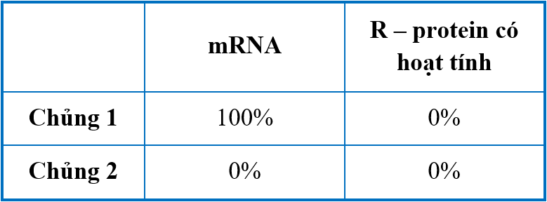 Bảng thể hiện hàm lượng mRNA của gene R và lượng R - protein có hoạt tính ở mỗi chủng.
