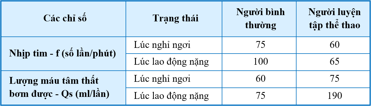 Bảng dưới đây cho biết khả năng làm việc của tim ở người bình thường và người luyện tập thể thao lâu năm: