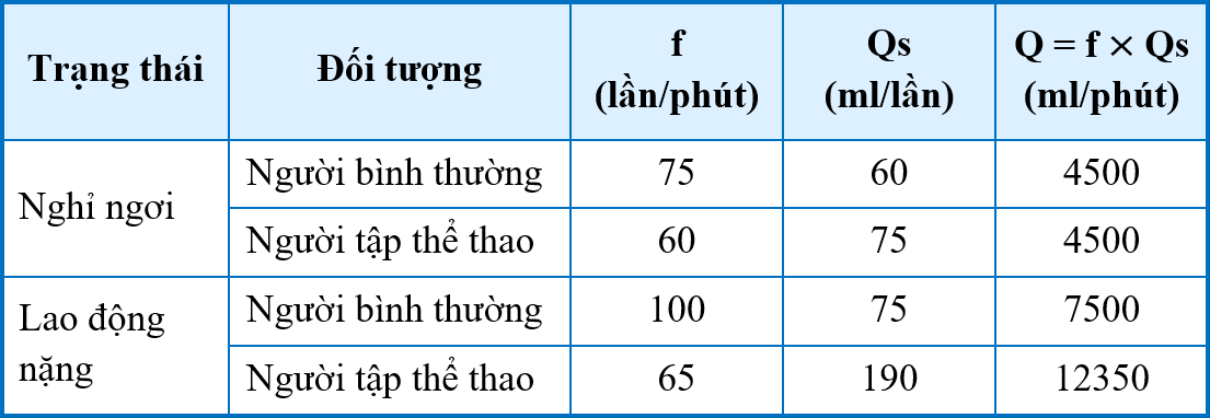 Bảng dưới đây cho biết khả năng làm việc của tim ở người bình thường và người luyện