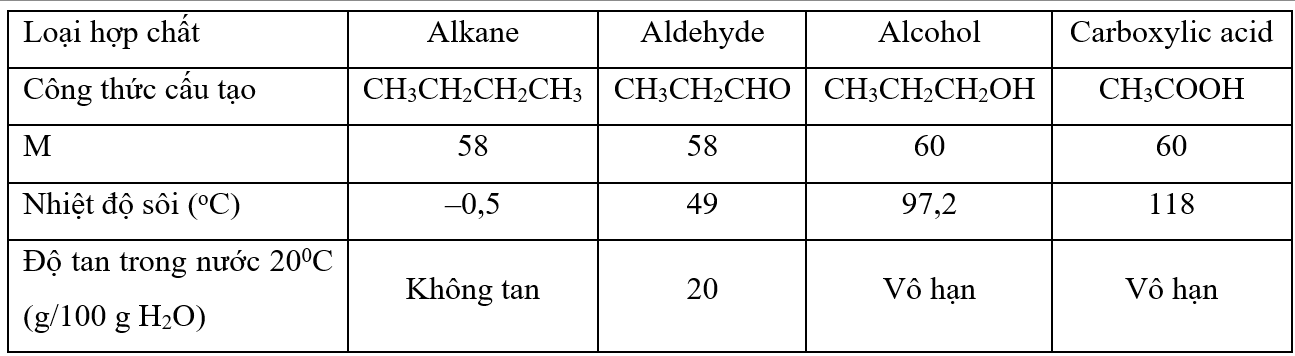 | c) Carboxylic acid có nhiệt độ sôi cao nhất vì có nhóm carboxylic acid phân cực và tạo được liên kết hydrogen giữa các phân tử bền nhất. | ||
