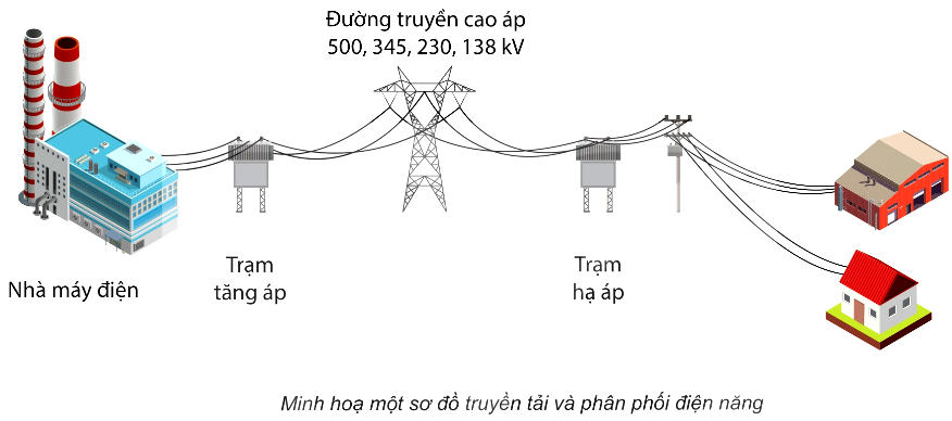 Điện áp ở đầu ra của nhà máy phát điện thường vào khoảng từ 10 kV đến 25 kV. Trước khi truyền tải điện năng đi xa, người ta sử dụng máy biến áp để tăng điện áp này đến giá trị khoảng từ 110 kV đến 500 kV. Trong phân phối điện năng, cần sử dụng nhiều máy biến áp đặt ở các trạm điện khác nhau để hạ điện áp xuống mức phù hợp với nơi sử dụng. Ở nước ta, mức điện áp cuối cùng dùng trong các gia đình, văn phòng là 220 V (Hình vẽ).