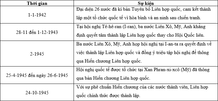 | a) Tháng 2 năm 1945, Liên Xô, Mĩ, Anh họp hội nghị Ianta quyết định thành lập tổ chức Liên hợp quốc. | ||