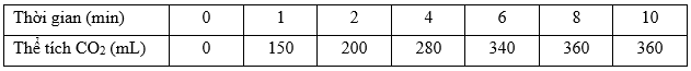 Cho một lượng dư đá vôi vào 100 mL dung dịch HCl. Theo dõi thể tích khí thoát ra theo thời gian, thu được kết quả trong bảng sau (thể tích khí đo ở 0oC, 1 atm)