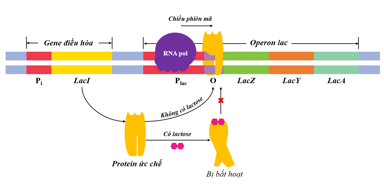 Hình sau đây mô tả hoạt động của Operon Lac ở vi khuẩn E.coli trong môi trường nuôi cấy. Phân tích hình và cho biết phát biểu nào sau đây là chính xác?