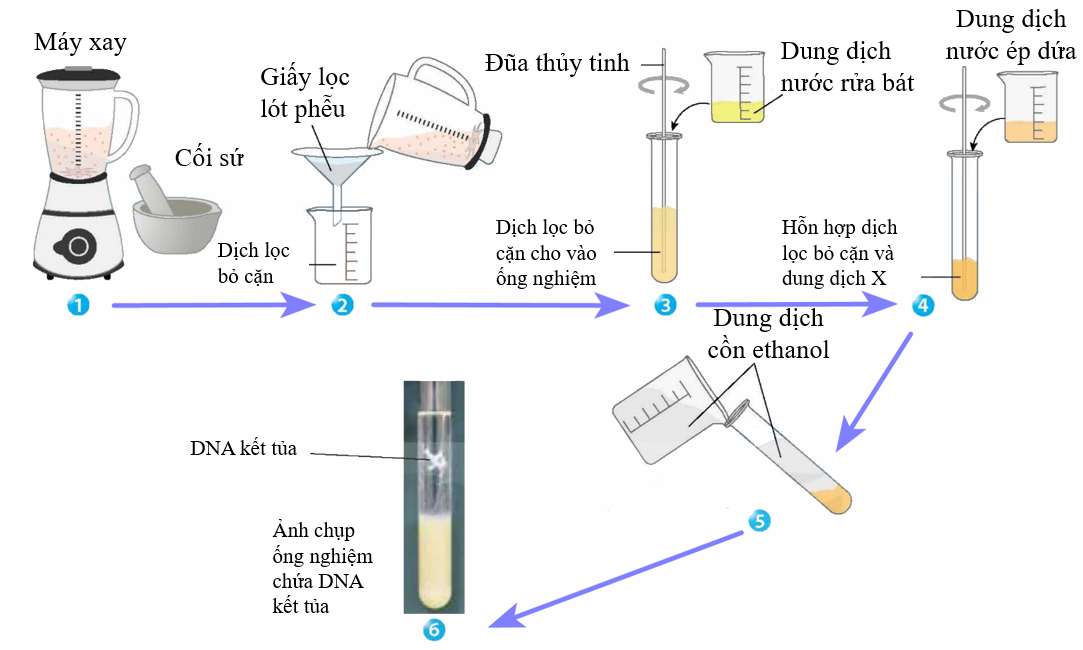 Tiến hành thí nghiệm tách chiết DNA theo các bước sau đây (biết các chất trong thí nghiệm đều được ước lượng chuẩn xác):