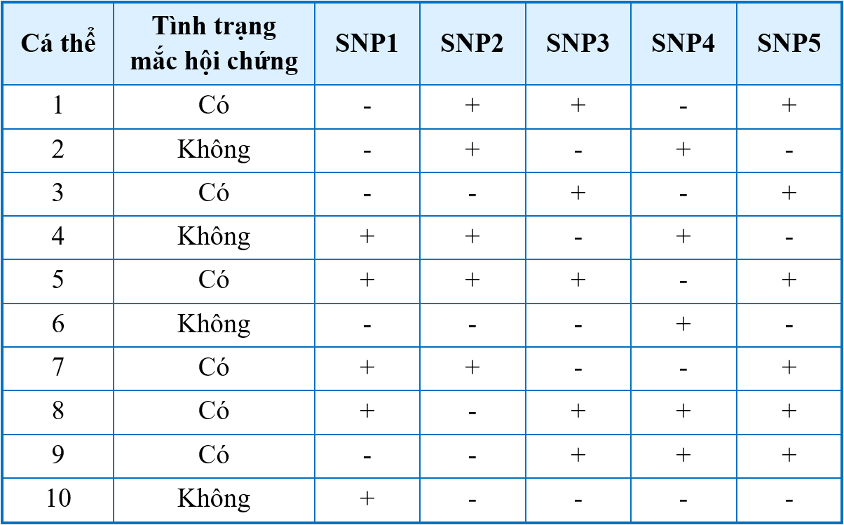 Đột biến thay thế đơn nu (single nucleotide polymorphism - viết tắt là SNP) là biến dị di truyền phổ biến nhất ở người. Giữa hai người bất kỳ ước lượng khác nhau khoảng ba triệu SNP. Hội chứng dị ứng lông mèo ở người được biết do gene nằm trên NST 20 gây nên. Để lập bản đồ gene này trên NST 20, người ta phân tích sự liên kết của một số SNP trên NST 20 với gene gây bệnh. Phân tích sự có mặt của các SNP ở 10 người bị mắc hoặc không mắc hội chứng thu được kết quả như sau: