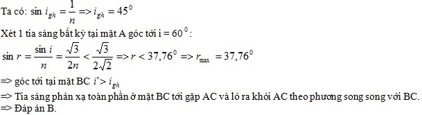Lăng kính có tiết diện là tam giác cân ABC, góc chiết quang A = 1200, chiết suất của lăng kính đối với mọi loại ánh sáng đều lớn hơn √2 . Chiếu tia sáng trắng tới mặt bên AB của lăng kính theo phương song song với BC sao cho toàn bộ chùm khúc xạ ở mặt AB truyền xuống BC. Tại BC chùm sáng sẽ: