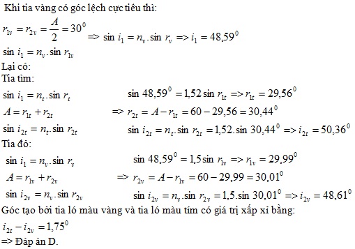 Một tia sáng trắng chiếu tới mặt bên của một lăng kính thuỷ tinh tam giác đều. Tia ló màu vàng qua lăng kính có góc lệch cực tiểu. Biết chiết suất của lăng kính đối với ánh sáng vàng, ánh sáng tím lần lượt là nv = 1,5 và nt = 1,52. Góc tạo bởi tia ló màu vàng và tia ló màu tím có giá trị xấp xỉ bằng: