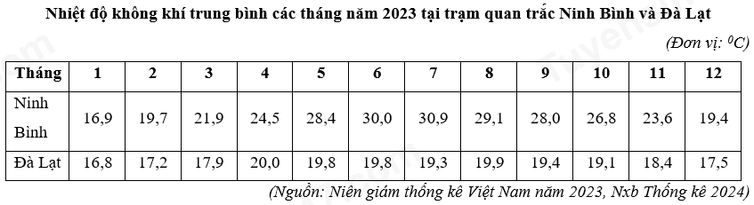 Căn cứ vào bảng số liệu trên, hãy cho biết nhiệt độ không khí trung bình năm ở Ninh Bình lớn hơn ở Đà Lạt bao nhiêu 0C (làm tròn kết quả đến một chữ số thập phân).