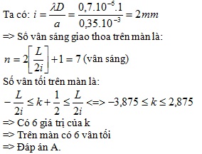 Trong một thí nghiệm về Giao thoa anhs sáng bằng khe I âng với ánh sáng đơn sắc λ = 0,7 μm, khoảng cách giữa 2 khe s1, s2 là a = 0,35 mm, khoảng cách từ 2 khe đến màn quan sát là D = 1m, bề rộng của vùng có giao thoa là 13,5 mm. Số vân sáng, vân tối quan sát được trên màn là: