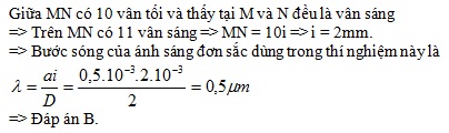 Trong thí nghiệm Y-âng về giao thoa ánh sáng, hai khe cách nhau a = 0,5 mm được chiếu sáng bằng ánh sáng đơn sắc. Khoảng cách từ hai khe đến màn quan sát là 2 m. Trên màn quan sát, trong vùng giữa hai điểm M và N mà MN = 2 cm , người ta đếm được có 10 vân tối và thấy tại M và N đều là vân sáng. Bước sóng của ánh sáng đơn sắc dùng trong thí nghiệm này là
