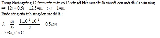 Trong thí nghiệm Iâng về giao thoa ánh sáng với ánh sáng đơn sắc, khoảng cách giữa hai khe là 1mm, khoảng cách từ hai khe tới màn là 2m. Trong khoảng rộng 12,5mm trên màn có 13 vân tối biết một đầu là vân tối còn một đầu là vân sáng. Bước sóng của ánh sáng đơn sắc đó là :
