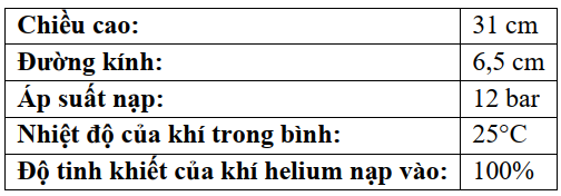 Một bình khí helium hình trụ dùng để bơm bóng bay có các thông số như hình vẽ. Biết 1 bar =