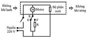 Máy sấy tóc là một thiết bị điện được sử dụng sau khi gội đầu để làm khô tóc. Hình bên là sơ đồ của một máy sấy tóc đơn giản, quạt (motor) và bộ phận sưởi ấm được kết nối với nguồn điện 220V. Công tắc K có thể được nối với tiếp điểm E hoặc F. Nhiệt độ của luồng không khí lạnh đi vào máy sấy là $20,0^{0}C$. Điện trở bộ phận sưởi là $60{\mkern 1mu} {\mkern 1mu} \Omega $. Nhiệt dung riêng của không khí là 1000 J/(kg.K). Ban đầu công tắc K ở tiếp điểm E thì lưu lượng không khí chảy qua máy là 0,05 kg/s. Bỏ qua mọi hao phí.