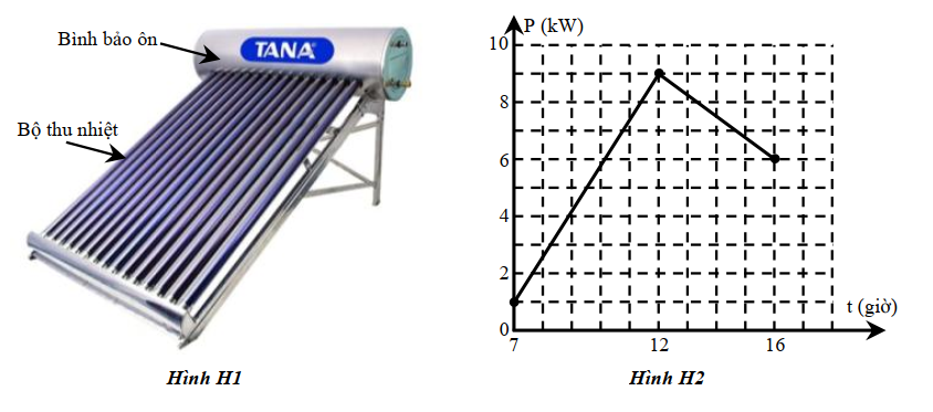Sử dụng các thông tin sau cho câu 27 và câu 28: Máy nước nóng năng lượng mặt trời là thiết bị chuyển đổi trực tiếp năng lượng ánh sáng Mặt Trời thành nội năng của nước, làm nóng nước phục vụ nhu cầu sinh hoạt của gia đình. Máy có ưu điểm là an toàn, tiết kiệm năng lượng. Cấu tạo của máy gồm 2 bộ phận chính: bộ phận thu nhiệt (gồm các ống hấp thụ nhiệt làm bằng thủy tinh) và bộ phận giữ nhiệt hay còn gọi là bình bảo ôn (bình này dùng để chứa nước) (hình H1). Biết dung tích của bình giữ nhiệt là 250 lít và luôn chứa đầy nước, nhiệt dung riêng của nước là 4200 J/kg.K, khối lượng riêng của nước là 1 kg/lít. Công suất bức xạ ánh sáng Mặt Trời mà máy thu được luôn thay đổi theo thời gian như hình H2. Biết 40% năng lượng của ánh sáng Mặt Trời chuyển hóa thành nhiệt lượng làm nóng nước.