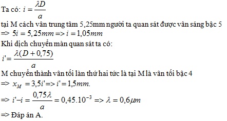 Thí nghiệm giao thoa Y- âng với ánh sáng đơn sắc có bước sóng λ, khoảng cách giữa hai khe a = 1 mm. Ban đầu, tại M cách vân trung tâm 5,25 mm người ta quan sát được vân sáng bậc 5. Giữ cố định màn chứa hai khe, di chuyển từ từ màn quan sát ra xa và dọc theo đường thẳng vuông góc với mặt phẳng chứa hai khe một đoạn 0,75 m thì thấy tại M chuyển thành vân tối lần thứ hai. Bước sóng λ có giá trị là