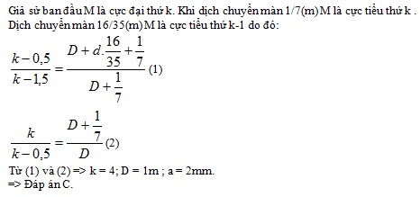 Cho thí nghiệm Y-âng, ánh sáng có bước sóng 500 nm. H là chân đường cao hạ vuông góc từ S1 tới màn M. Lúc đầu người ta thấy H là một cực đại giao thoa. Dịch màn M ra xa hai khe S1, S2 đến khi tại H bị triệt tiêu năng lượng sáng lần thứ nhất thì độ dịch là 1/7 m. Để năng lượng tại H lại triệt tiêu thì phải dịch màn xa thêm ít nhất là 16/35 m. Khoảng cách hai khe S1 và S2 là