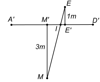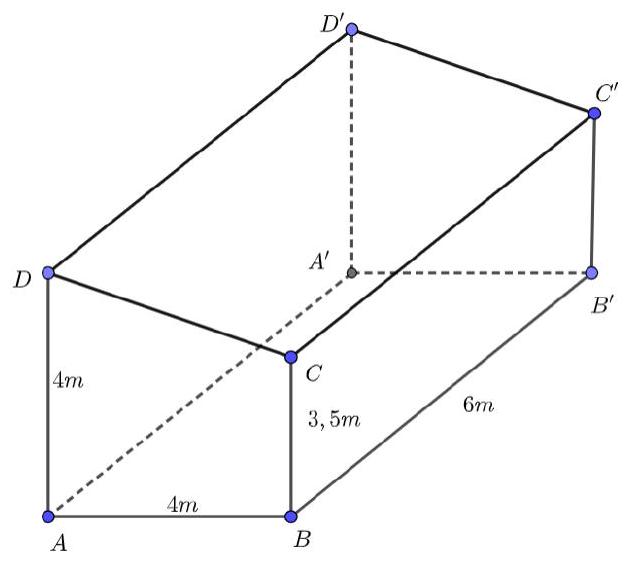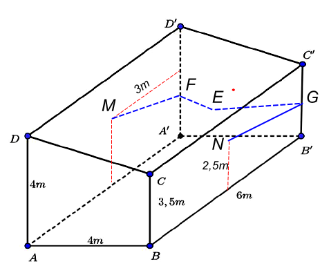 Một ngôi nhà hình lăng trụ đứng $ABCD \cdot A'B'C'D'$ có đáy $ABCD$ là hình thang vuông tại $A$ và $B$. $AB = AD = 4(m);BC = 3,5(m);BB' = 6m\ $ (xem hình vẽ). Ở bức tường $ADD'A'$ người ta lắp một bóng điện cách cạnh $A'D'$ một khoảng bằng $3(m)$ và cách mặt sàn một khoảng bằng $3(m)$, còn ở bức tường $BCC'B'$ người ta lắp một bóng điện cách cạnh $B'C'$ một khoảng bằng $3(m)$ và cách mặt sàn một khoảng bằng $2,5(m)$. Một bảng điều khiển được đặt tại bức tường $A'B'C'D'$ cách cạnh $A'D'$ một khoảng bằng $1(m)$ và cao $1,5(m)$ so với mặt sàn. Người ta muốn nối dây điện từ bảng điểu khiển men theo các bức tường (không mắc lên mái) đến 2 bóng điện trên. Hỏi cần tối thiểu bao nhiêu mét dây điện? (làm tròn kết quả đến hàng phần mười).