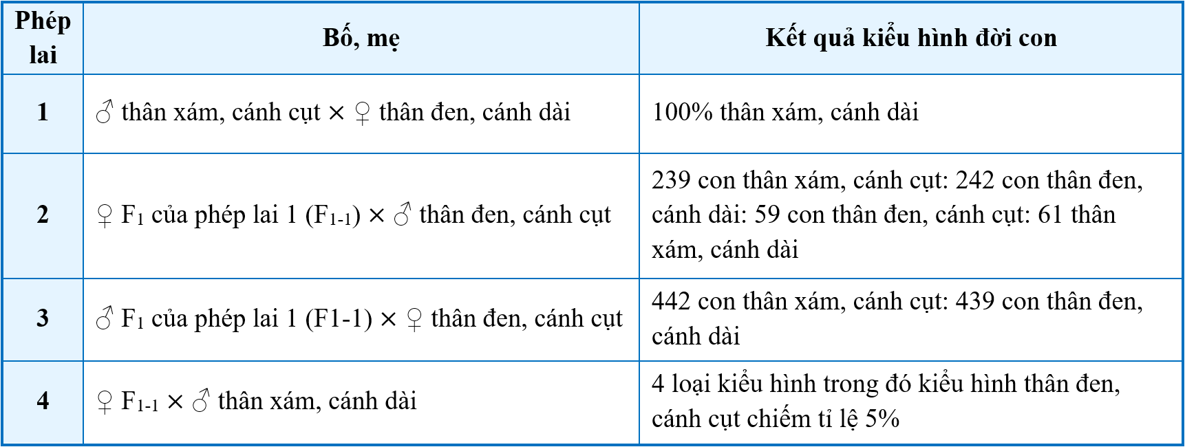 Dựa trên thí nghiệm của Morgan để nghiên cứu sự di truyền của các tính trạng. Một nhóm nghiên cứu tiến hành các phép lai trên ruồi giấm trong phòng thí nghiệm và thu được kết quả sau: