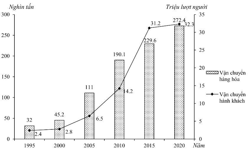 | b) Giai đoạn 1995 – 2020 khối lượng hàng hóa vận chuyển tăng nhanh hơn khối lượng hành khách vận chuyển. | ||