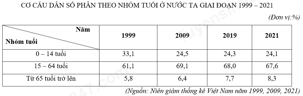 Dựa vào bảng số liệu, hãy cho biết số dân trong nhóm 15 – 64 tuổi của nước ta năm 2021 là bao nhiêu triệu người, biết tổng số dân nước ta năm 2021 là 98,5 triệu người? (làm tròn kết quả đến một chữ số thập phân).