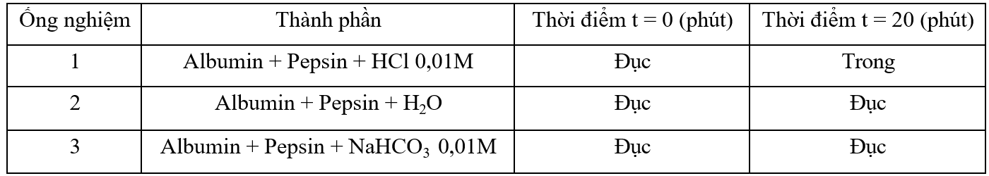 Một nhóm học sinh nghiên cứu khoa học, khảo sát sự ảnh hưởng của pH môi trường đến khả năng hoạt động của enzyme trong quá trình tiêu hóa ở người. Một trong số thí nghiệm, nhóm học sinh đã khảo sát sự thủy phân albumin (protein có trong lòng trắng trứng) bằng enzyme pepsin được trình bày dưới bảng sau: