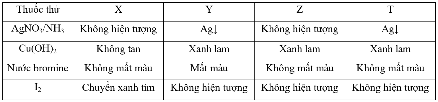 Bảng dưới đây ghi lại hiện tượng khi làm thí nghiệm với các chất glucose, fructose, saccharose, amylose ở dạng dung dịch với dung môi nước được kí hiệu ngẫu nhiên không theo thứ tự là X, Y, Z, T: