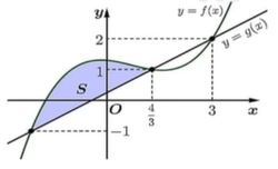 Cho $y = f(x),\,\, y = g(x)$ lần lượt là các hàm đa thức bậc ba và bậc nhất có đồ thị như hình vẽ. Biết diện tích hình $S$ (được tô màu) bằng $\dfrac{250}{81}$