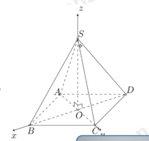 Cho hình chóp đều $S.ABCD$ có $O$ là tâm của đáy $ABCD$ và $G$ là trọng tâm của tam giác $SAB$. Biết cạnh $SA = 4,\,\, AB = 2\sqrt{2}$. Hệ trục tọa độ $Oxyz$ như hình vẽ.