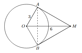 Từ điểm $M$ nằm ngoài đường tròn $\left( {O;3cm} \right)$, kẻ hai tiếp tuyến $MA,\,\, MB$ ($A,\,\, B$ là các tiếp điểm). Biết $OM = 6cm$