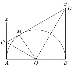 Cho nửa đường tròn $\left( {O;R} \right)$ đường kính $AB$. Gọi $Ax,\,\, By$ là các tiếp tuyến tại $A$ và $B$ của nửa đường tròn. Từ điểm $M$ trên nửa đường tròn ($M$ khác $A,\,\, B$), kẻ tiếp tuyến cắt $Ax,\,\, By$ tương ứng tại $C,\,\, D$