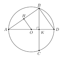 Cho đường tròn $\left( {O;OA} \right)$ và đường kính $AD = 12,5\left( {cm} \right)$. Lấy điểm $B$ thuộc đường tròn $\left( {O;OA} \right)$ sao cho $AB = 10cm$. Kẻ dây $BC$ vuông góc với đường kính $AD$. Tổng khoảng cách từ tâm $O$ đến các dây $AB$ và $BC$ là