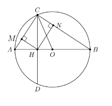 Cho đường tròn $(O)$ và đường kính $AB = 13cm$. Dây $CD = 12cm$ vuông góc với $AB$ tại $H$. Gọi $H$ tương ứng là hình chiếu của $H$ lên $AC,\,\, BC$. Diện tích tứ giác $CMHN$ là (làm tròn kết quả đến hàng phần mười)