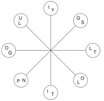 Work clockwise round the circles to spell out two eight-letter words that are synonyms. Each word commences in a different circle, and you must find the starting point of each. Every letter is used once each and all letters are consecutive.