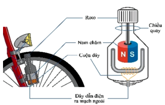 Sử dụng các thông tin sau cho hai câu hỏi phía dưới: Cấu tạo của dynamo (đi-na-mô) xe đạp được mô tả như hình bên. Nhận định nào sau đây là đúng hay sai về nguyên tắc hoạt động của dynamo?