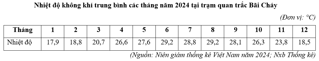 Cho bảng số liệu:Căn cứ vào bảng số liệu trên, hãy cho biết nhiệt độ không khí trung bình