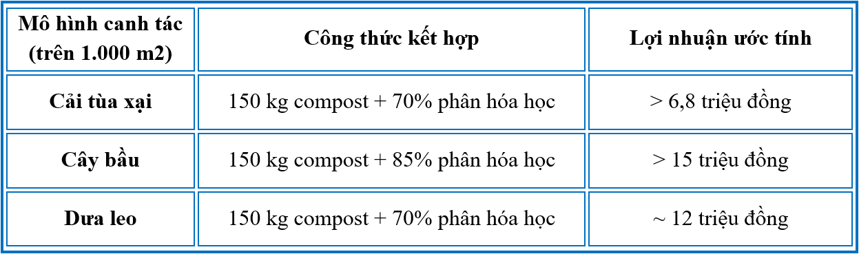 [4] Kết quả thực nghiệm tại An Giang khi kết hợp phân compost với phân hóa học (theo tỷ lệ giảm dần phân vô cơ) đã cho thấy những con số ấn tượng về kinh tế: