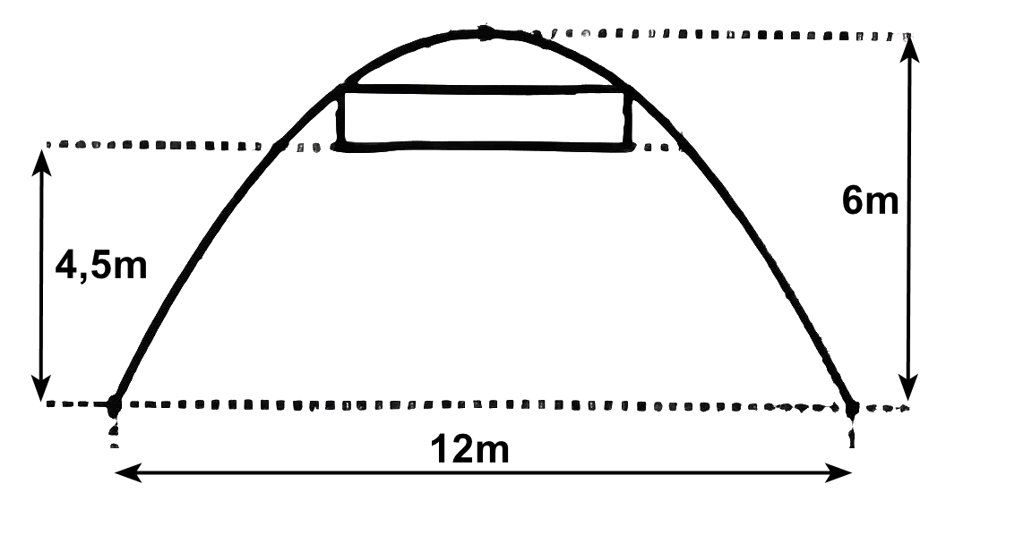 Cổng một ngôi trường có dạng hình parabol cao 6 m, khoảng cách giữa hai chân cổng là 12 m. Nhà trường dang thiết kê để treo một màn hình led hình chữ nhật có 2 đỉnh nằm trên đường parabol ở độ cao bằng nhau, mép dưới màn hình led cách mặt đất 4,5 m. Hỏi diện tich cúa màn hình led lớn nhất là bao nhiêu mét vuông?
