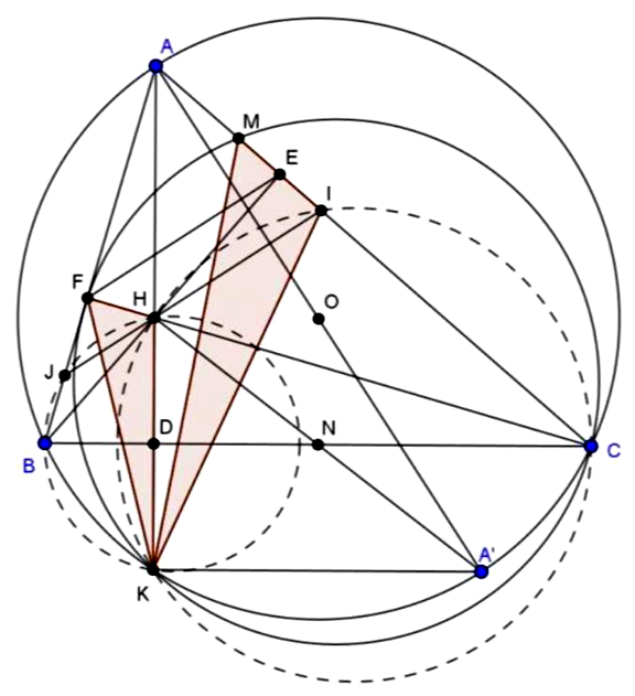 Cho tam giác $ABC$ có ba góc nhọn, nội tiếp đường tròn ($O$). Các đường cao $BE,CF$ của tam giác $ABC$ cắt nhau tại $H$ ($E$ thuộc $AC,F$ thuộc $AB$). Đường thẳng $AH$ cắt $(O)$ tại điểm thứ hai là $K$.