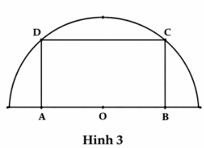 Bác An muốn dựng khung cổng hình chữ nhật $ABCD$, bên ngoài cổng được bao bởi một khung sắt dạng nửa đường tròn tâm $O$ có bán kính $5m$ (Hình 3). Tính các kính thước của khung cổng để diện tích $ABCD$ lớn nhất.