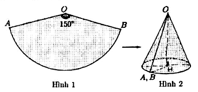 1) Từ một mảnh bìa hình quạt tròn bán kính 24 (cm) ứng với cung $150^{\circ}$ (hình 1), Nam gắn hai mép giấy dọc theo các bán kính $OA,OB$ lại với nhau để tạo một chiếc mũ sinh nhật có dạng hình nón không đáy (hình 2). Hãy xác định chiều cao của chiếc mũ.
