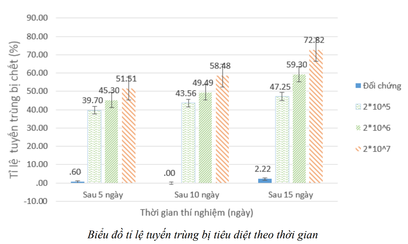 “Trong suốt thời gian thí nghiệm, hiệu quả tiêu diệt tuyến trùng ở mật độ 2.105 CFU/ml và 2.106 CFU/ml luôn có sự chênh lệch rõ rệt và tăng trưởng vượt bậc so với mật độ 2.107 CFU/ml.”